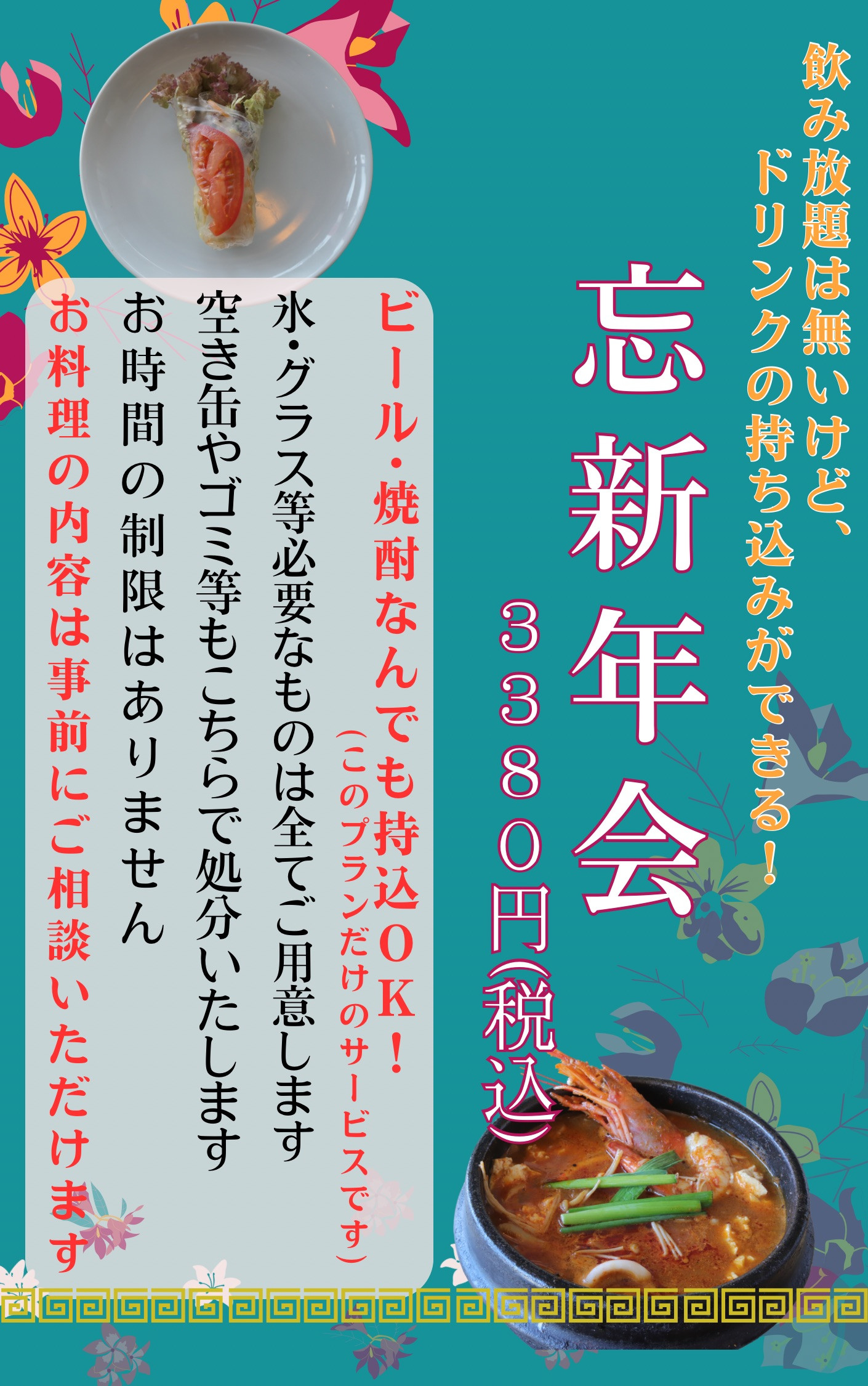 😃忘年会・新年会プランのご案内です。 飲み放題プランが無い代わりに飲み物の持ち込みが自由です。ビールでもワインでも日本酒でもソフトドリンクでも何でもOK! お料理の要望もできる限りお応えします。まだ忘年会お決まりでない方是非ご検討ください。