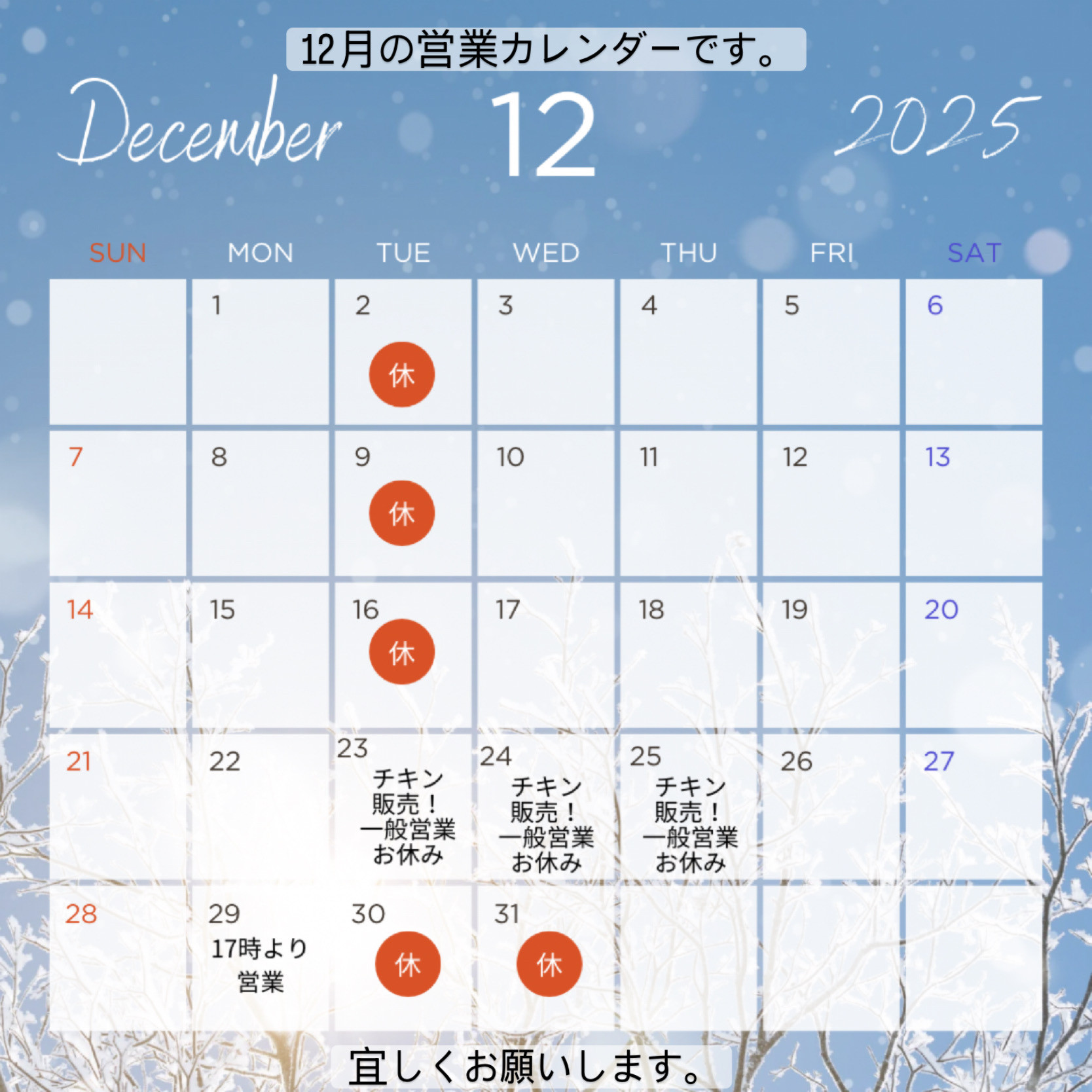 23日24日25日の三日間はクリスマスチキン販売のため通常営業はおこないません。